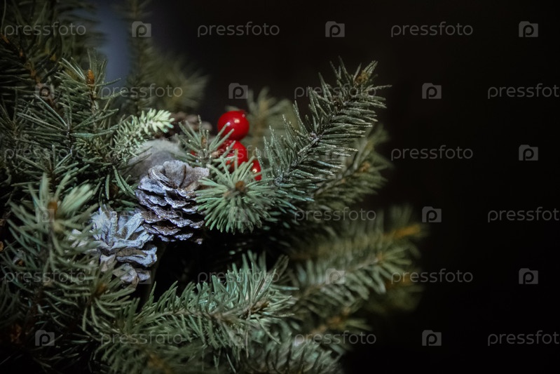 Рождественская композиция из еловых веток и шишек на черном фоне