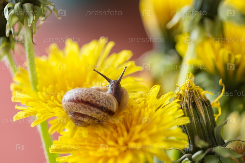 Маленькая улитка ползает по желтому цветку одуванчика