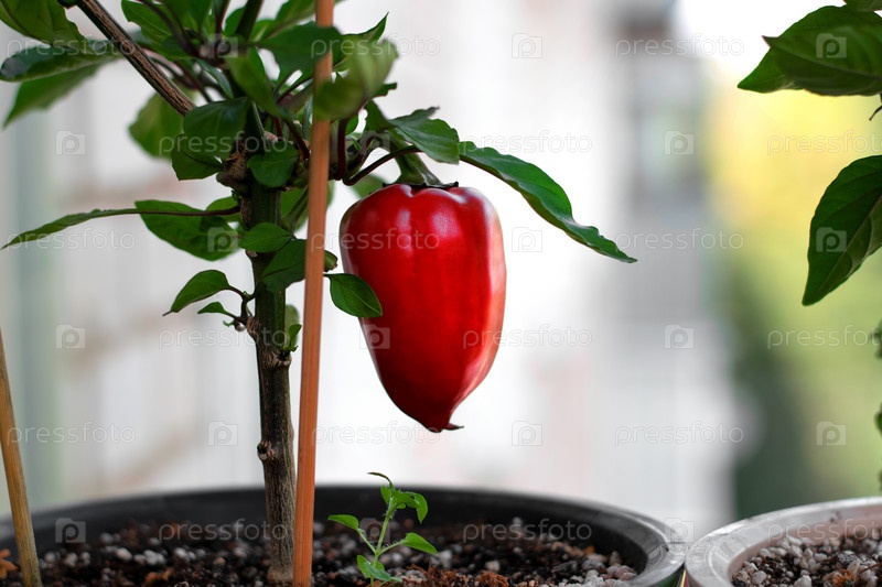 Красный сладкий перец растет в горшке на подоконнике балкона. Урожай на оконной ферме