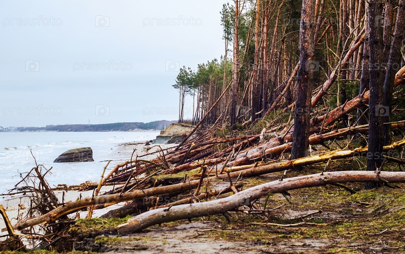 Разруха после бури. Обрушившиеся морские берега. Упавший поврежденный лес. Последствия морского шторма