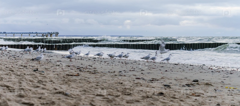 Чайки на берегу моря. Погода на морском курорте ненастная. Осенний морской пейзаж