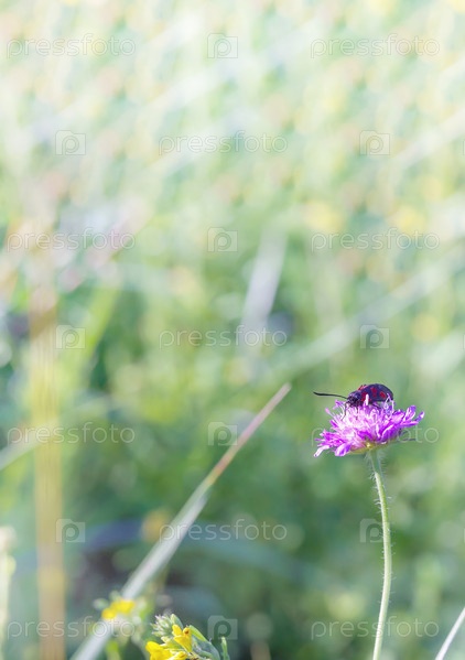 Открытка лето. Луговой цветок в траве. Жук на полевом цветке