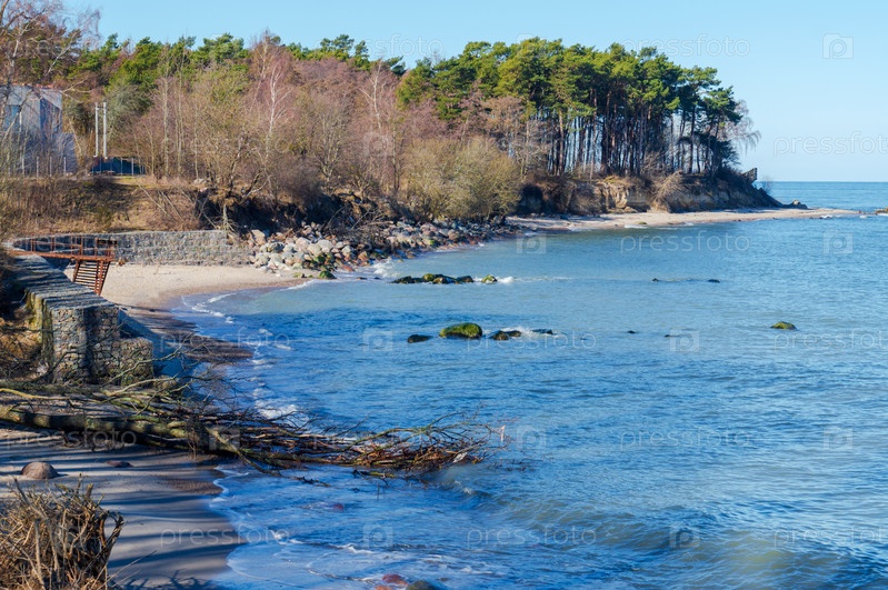 Сосновый лес на берегу моря. Песчаный берег моря. Волны на Балтийском море