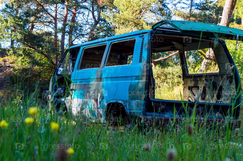 Брошенная машина в лесу. Старый, поврежденный автомобиль. Дефектный автомобиль. Автомобиль, непригодный для дорог