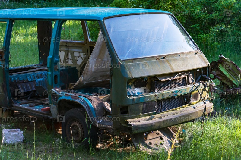 Брошенная машина в лесу. Старый, поврежденный автомобиль. Дефектный автомобиль. Автомобиль, непригодный для дорог