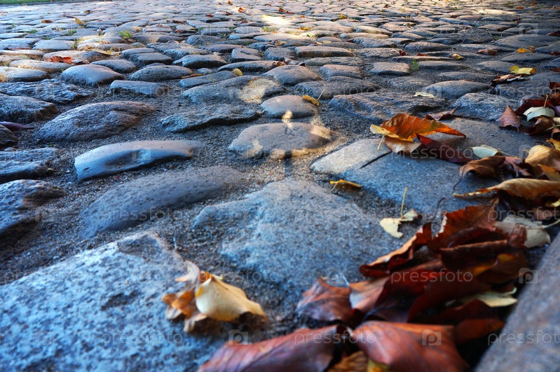 Опавшие осенние листья на тротуаре, желтые и красные осенние листья на дороге