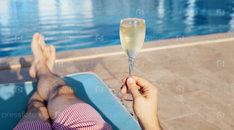Молодой человек в шортах лежит на шезлонге и держит элегантный прохладный бокал шампанского с длинным стеблем