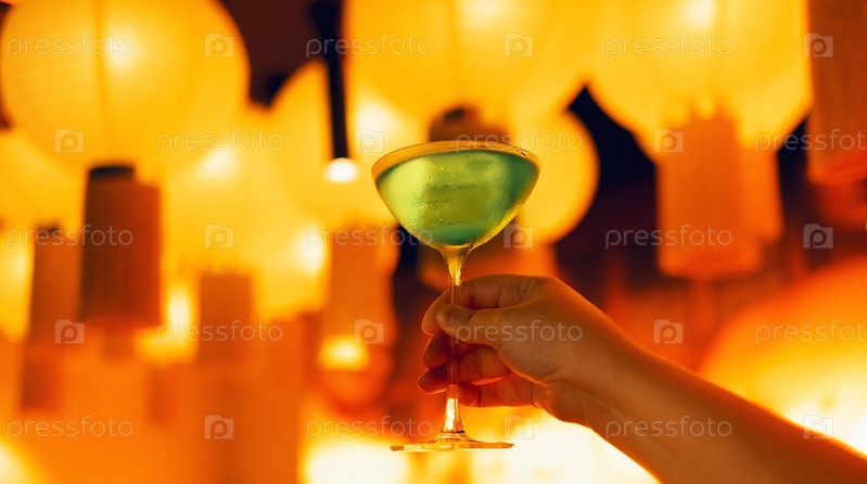 Крупный план женской руки, держащей в помещении элегантный стакан с длинной ножкой бирюзово-зеленого коктейля
