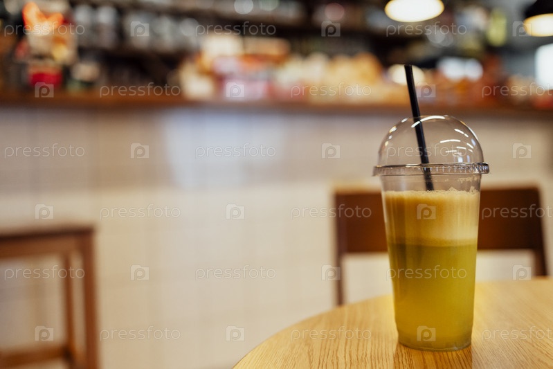 Вкусный зеленый коктейль с белой пеной в прозрачной пластиковой чашке и соломинкой на деревянном столе в кафе