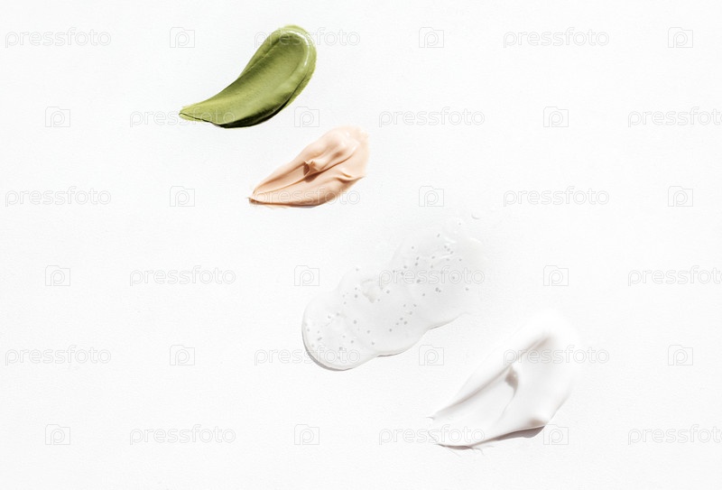 Косметические мазки зеленого, розового и белого цветов крема на ярком фоне. Различные текстурированные мазки косметических продуктов на белом фоне. Концепция здоровья и ухода за кожей. Вид сверху. Копировать пространство