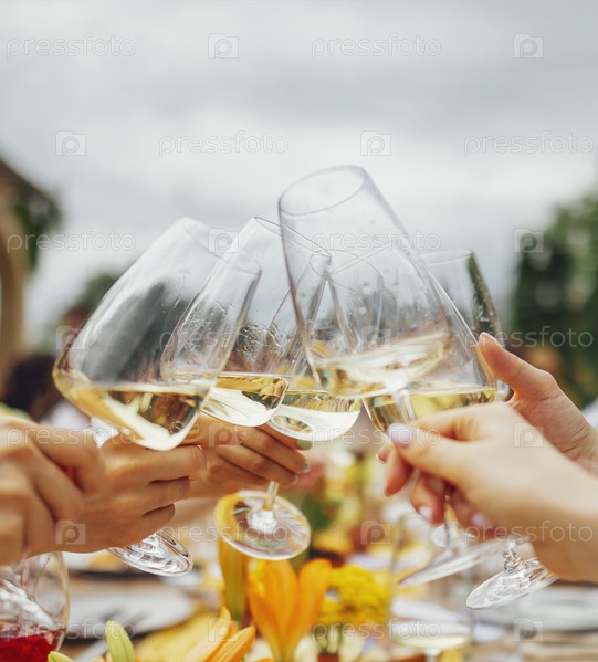 Женские руки держат элегантные бокалы с длинной ножкой шампанского и звенят ими на фоне стола с закусками и цветами