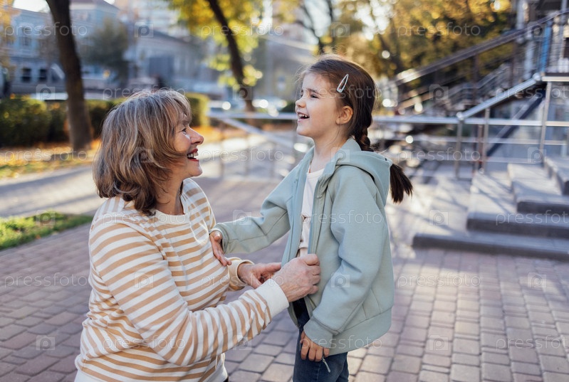 Улыбающаяся красивая пожилая женщина в повседневной одежде и ее маленькая милая внучка, играющая на улице