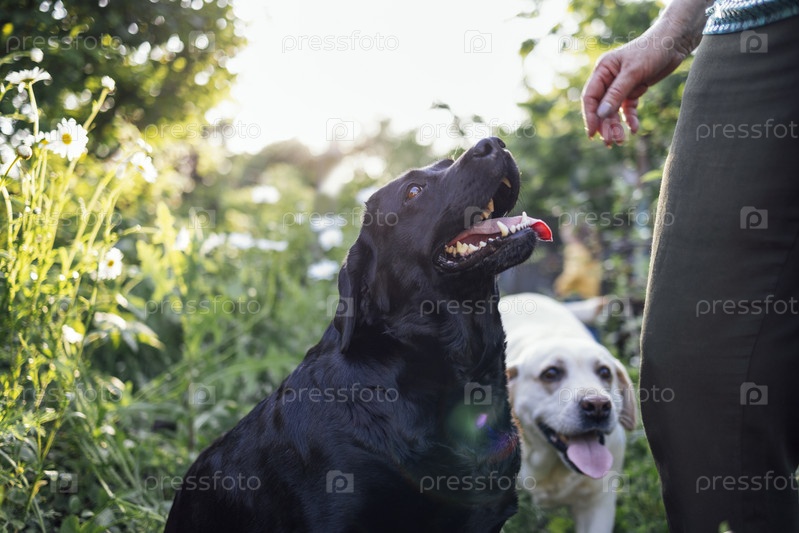 Женщина со своими домашними животными гуляет по парку. Черный и золотой лабрадор-ретриверы на природе со своим хозяином