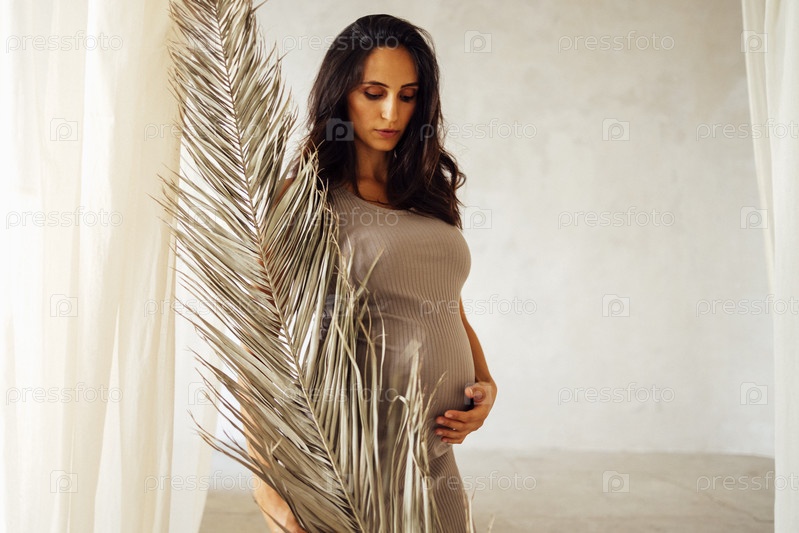 Молодая красивая беременная брюнетка позирует в студии с пальмовым листом
