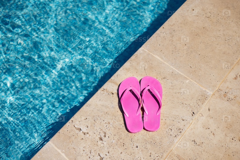 Розовый шлепанец на гранитном бассейне во время отпуска в отеле