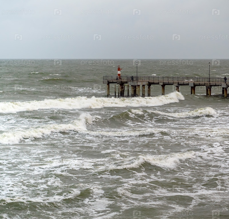 Приливы и штормы на море. Морской пирс. Волны на Балтийском море. Пустынный берег моря