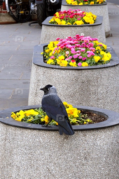 Ворон сидит на клумбе, черная птица на клумбе