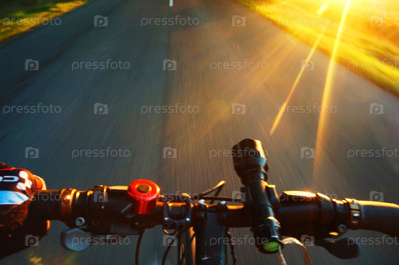 Велопрогулка летним вечером на закате, колесо велосипеда в движении крупным планом