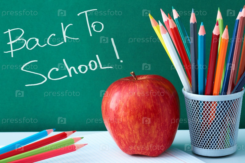 Цветные карандаши и яблоко на фоне школьной доски