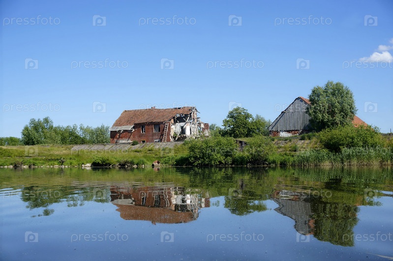 Одинокий старый дом на озере, дома, отраженные в озере, поверхность озера, спокойствие