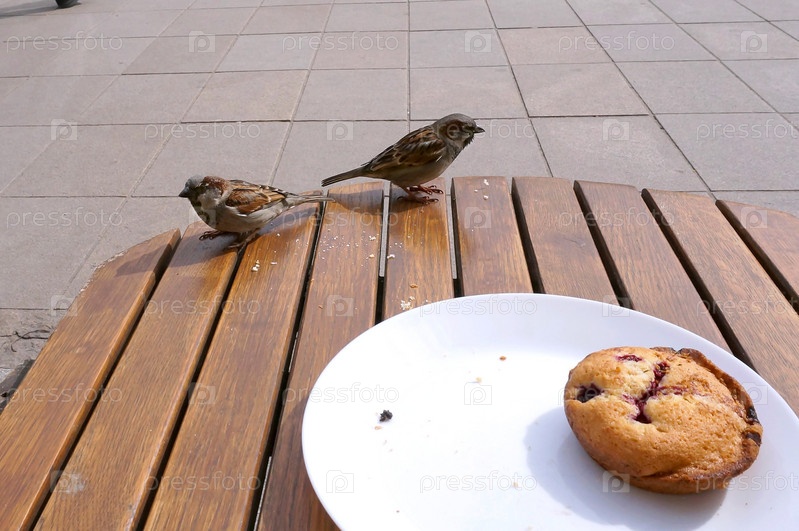 Воробьи на столе в кафе, воробьи и кекс на столе в кафе на улице