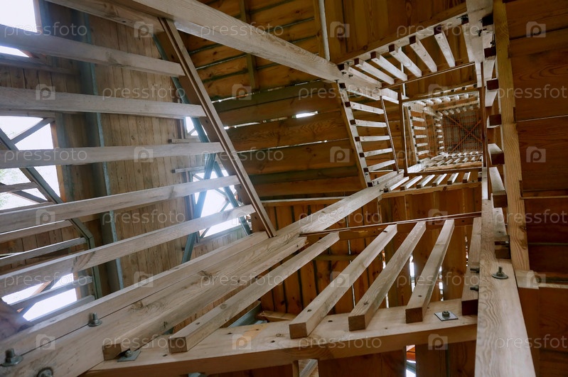 Вид на лестничную клетку снизу, деревянная лестница на смотровую башню