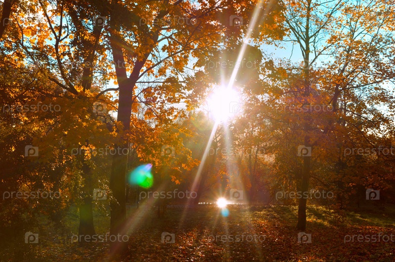 Солнце сквозь ветки, осенний лес, осень в парке, желтые и красные листья на деревьях осенью