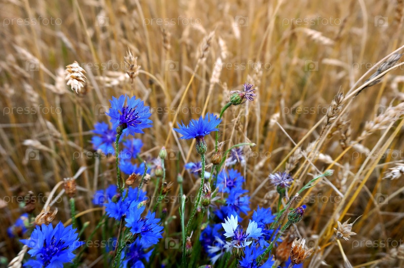Синие васильки среди желтых колосьев, поле синих васильков между колосьями