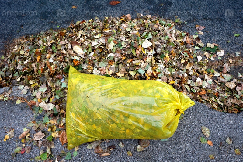 Желтые мешки для мусора, наполненные опавшими листьями, уборка улиц осенью