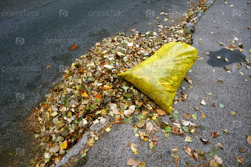 Желтые мешки для мусора, наполненные опавшими листьями, уборка улиц осенью