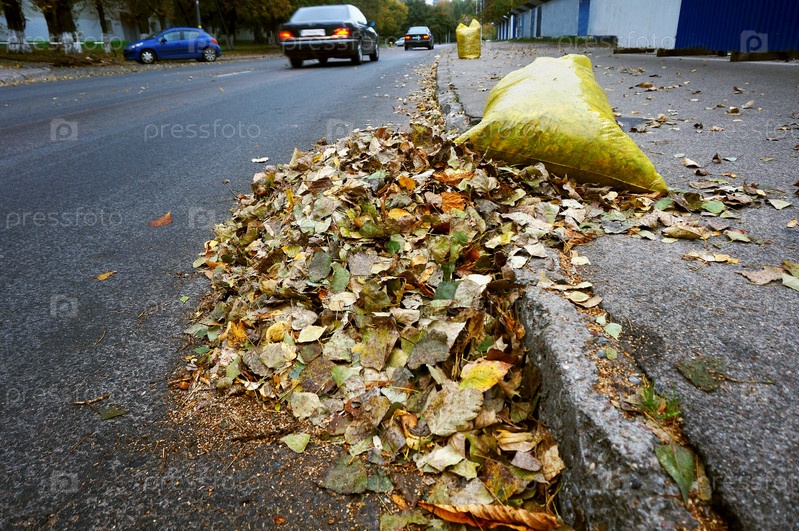 Желтые мешки для мусора, наполненные опавшими листьями, уборка улиц осенью