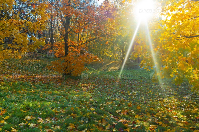 Солнце сквозь ветки, осенний лес, осень в парке, желтые и красные листья на деревьях осенью