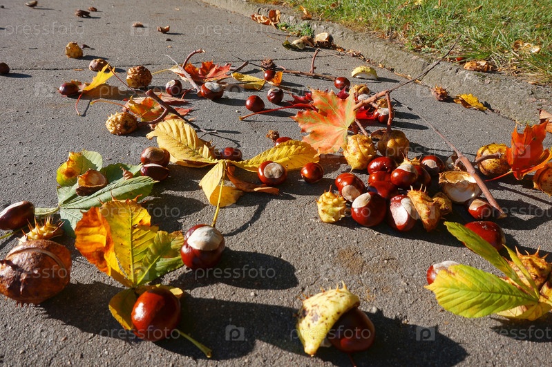 Плоды и листья каштана на тротуаре, опавшие осенние листья каштана и другие