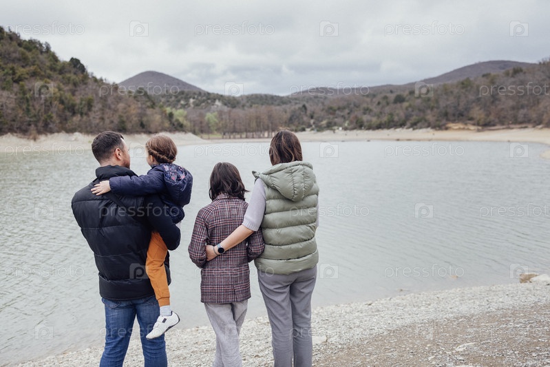 Счастливая семья с двумя детьми у озера. Люди одеты в теплые куртки и пальто