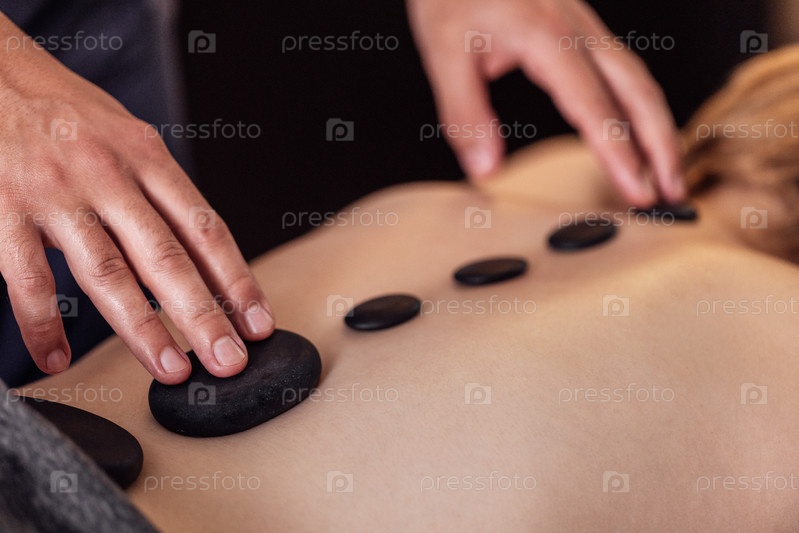 Крупный план мужских рук массажиста, делающего массаж горячими камнями своей клиентке