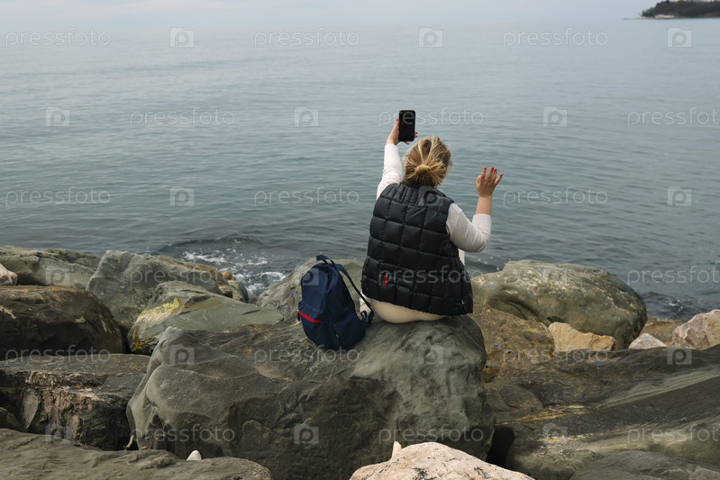 Молодая женщина в повседневной одежде с рюкзаком делает селфи на море