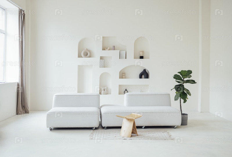Стильный светлый интерьер. Белая стена с нишами. Вазы, камни, книги на полках