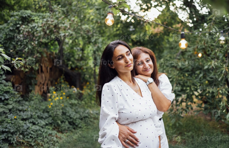 У привлекательной беременной брюнетки мама обнимается на улице в саду
