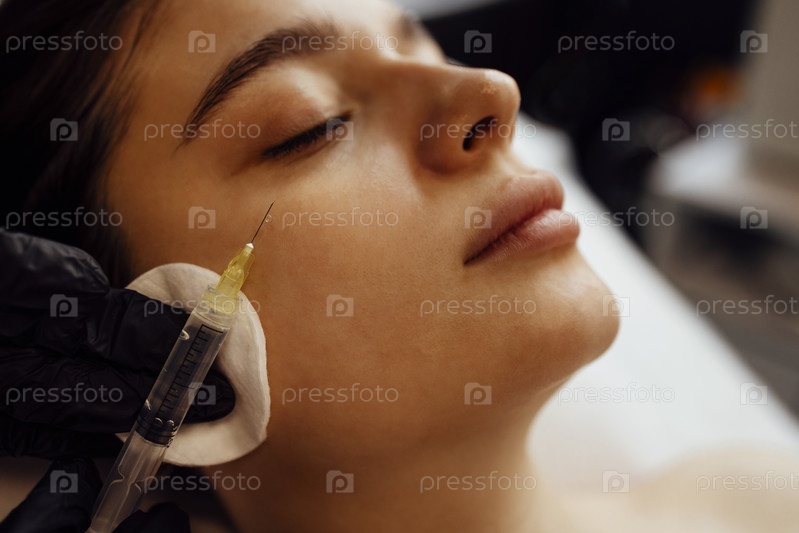 Женщина-косметолог в прозрачных перчатках делает укол в нижнюю челюсть своего клиента