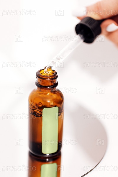 Крайний крупный план женской руки и пипетки. Из пипетки капает прозрачная капля эссенции, масла или геля. Размытая коричневая стеклянная бутылка сыворотки на заднем плане. Концепция натуральной органической косметики