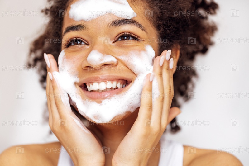 Крупный план молодой красивой темнокожей женщины, очищающей кожу средством для умывания