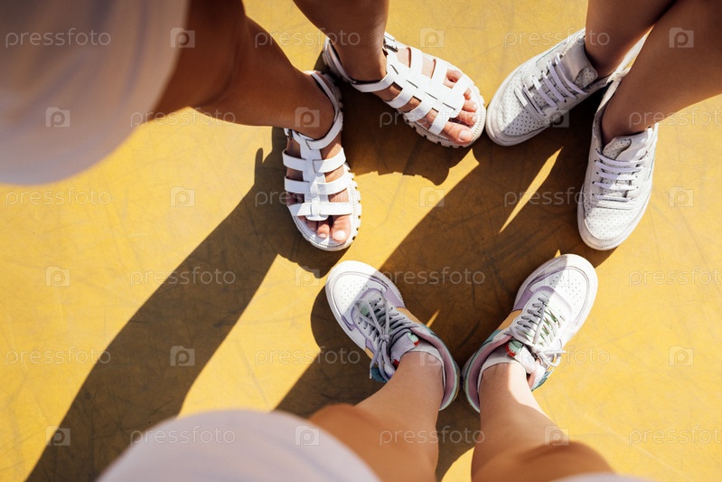 Три пары ног семьи стоят вместе на желтом фоне. Милое селфи трех пар женских ног в белых сандалиях и кроссовках. Концепция дружбы и путешествий