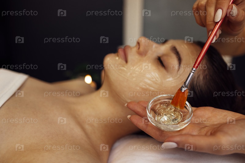 Мастер красоты наносит на лицо клиента омолаживающую маску