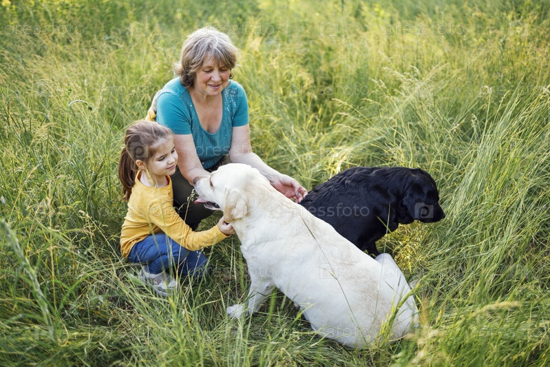 Седая бабушка и милая маленькая внучка вместе выгуливают своих собак в парке