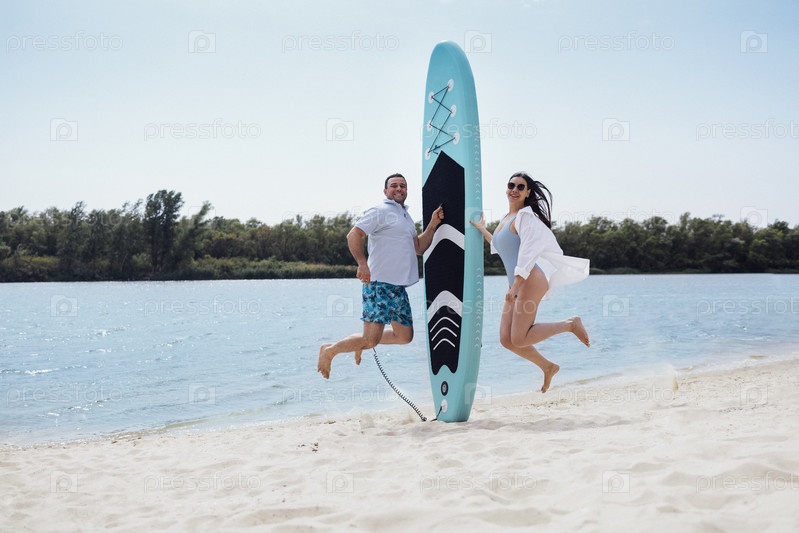 Пара серферов на пляже. Мужчина стоит с веслом и улыбается