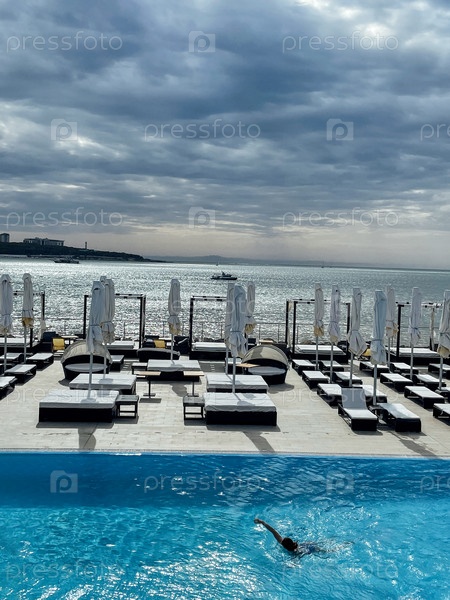 Раннее утро в роскошном отеле у моря. Одинокая женщина плавает в лазурной воде бассейна