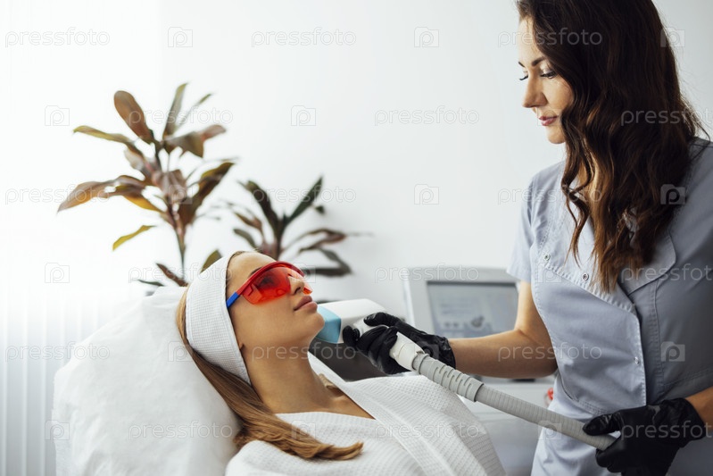 Молодая женщина получает фотоэпиляцию во время посещения салона красоты в салоне