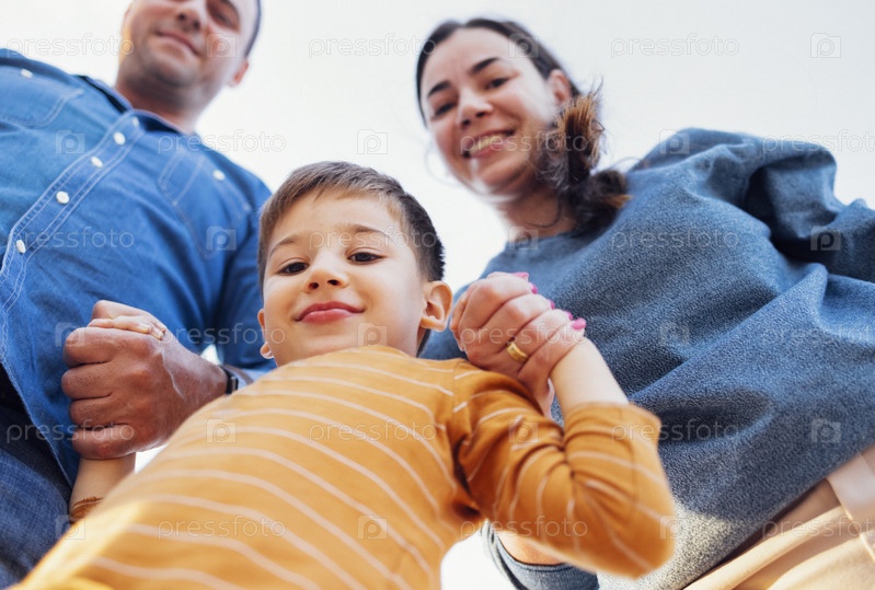 Позитивные белые родители держатся за руки своего маленького сына. Счастливая семья на прогулке. Мама, папа и сын в повседневной одежде смотрят в камеру и улыбаются