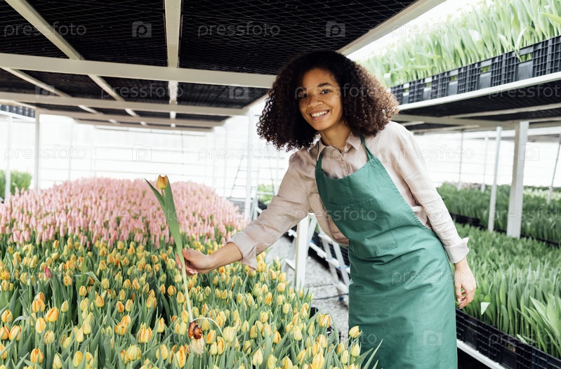 Женские руки африканской девушки в зеленом фартуке, держащей тюльпан на фоне теплицы