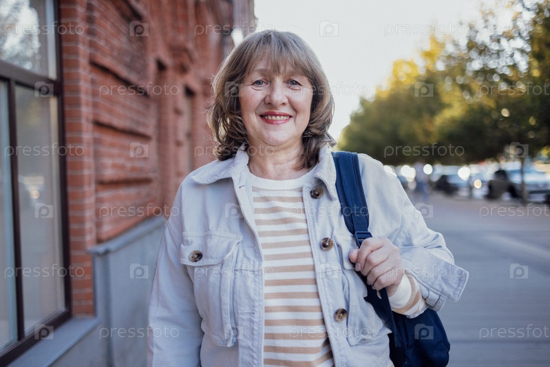 Привлекательная блондинка средних лет с вьющимися волосами в стильной джинсовой одежде